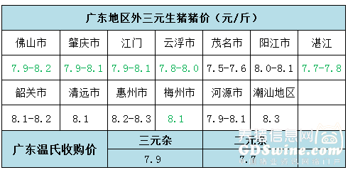 【养猪信息网今日猪评】:13日,广东外三元平均收购价格为8.05元/斤,较昨日下跌0.04元/斤。目前主流收购价格为7.9-8.1元/斤。温氏收三元杂收购价7.9元/斤,二元杂收购价7.7元/斤。为网友报价汇总,价格有所下调。