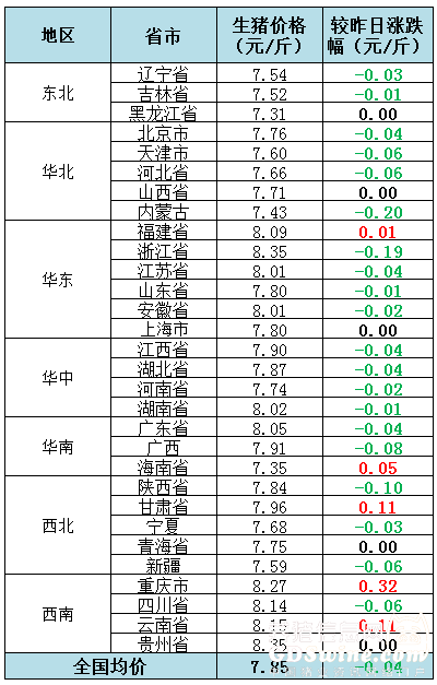 【信息网今日猪评】:13日,全国生猪均价为7.85元/斤,较昨日下跌0.04元/斤。30个地区中,5个地区较昨日上涨,25个地区下跌或不变;幅度在-0.20~0.32元/斤。