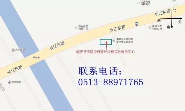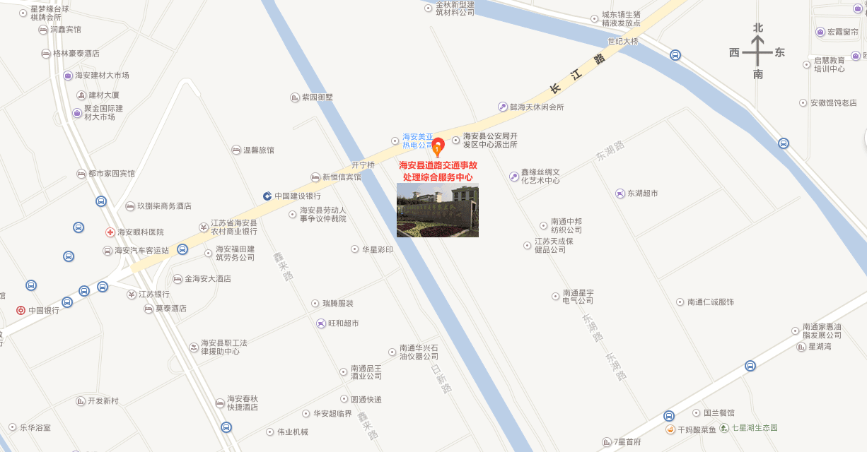 海安县道路交通事故处理综合服务中心地址(汽车站向东、火车站向西,人社局东侧 约500米左右,热电厂对面,大门朝北)