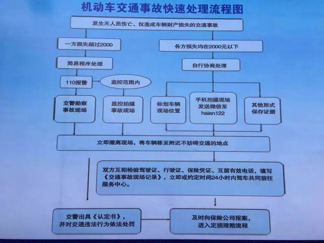 一、发生轻微(不伤人)损失在2000元以下(机动车与机动车之间)的交通事故,无需打110报警,更不要坐等交警来现场处理(无人员受伤、车辆可移动)只需要用手机拍摄现场照片(三张以上,照片内容需包含事故现场位置、车辆号牌、车辆碰撞部位)发送至微信(微信号haian122),双方当事人互验证件、互留联系方式,携带驾驶证、行驶证、保单直接到海安县道路交通事故处理综合服务中心定责理赔。