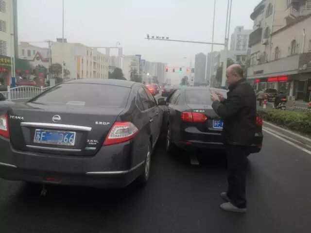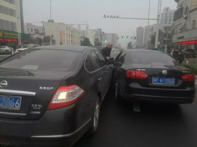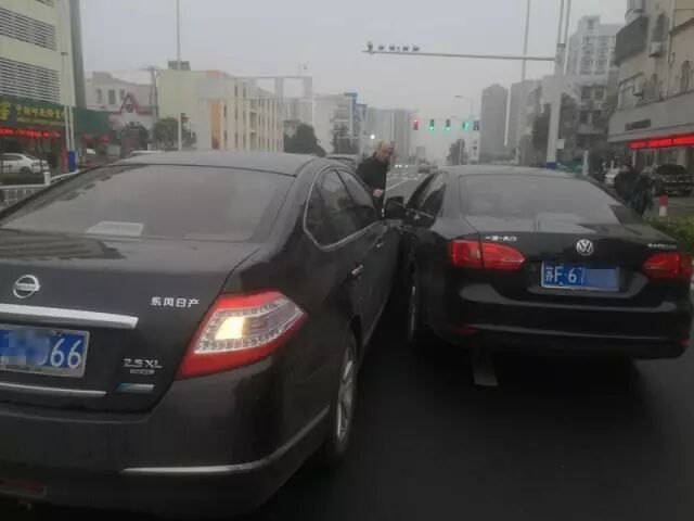 今天上午约8时30分左右,在城区宁海南路与永安路交叉路口红绿灯北侧由北向南车道约70米处,两辆轿车相碰,“长时间横在路中间”,“一司机在不停的打电话,另一司机在车内等交警”由于靠近灯控路口,后方来车不知道前面发生什么情况,先是停车等候,发觉“不对劲”后“纷纷慢慢绕过去”,严重影响了路面车辆通行。
