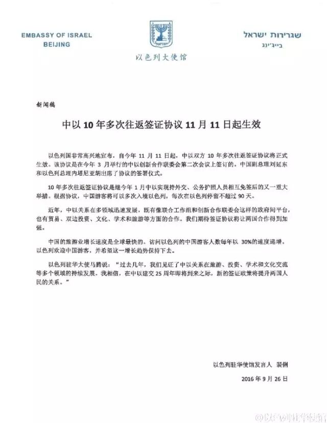 -中国个人游客将可以商务或旅游为目的,多次入境以色列,每次停留不超过90天。