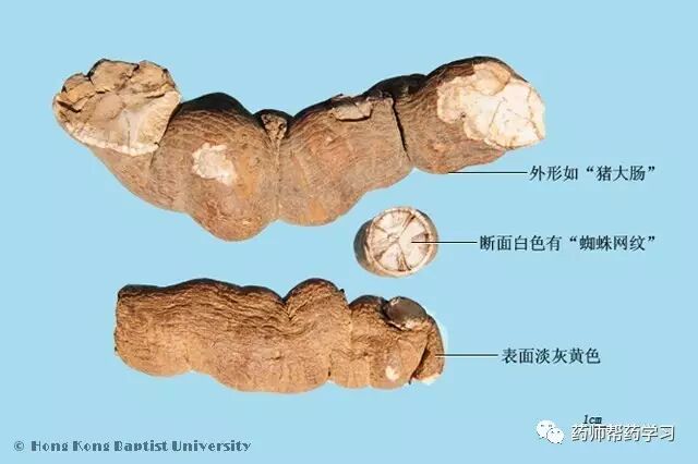【性状】根不规则圆柱形,形如“猪大肠”,剖切成半圆柱形或块状,常弯曲,弯曲处有深陷横沟而呈结节状,长5~15cm,直径1~5cm。表面灰黄色,有细皱纹及横向突起的皮孔。质坚重,断面平坦,灰白色,有“蜘蛛网纹”,具粉性。气微,味苦。