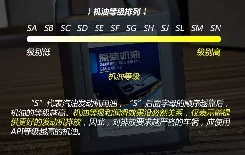 S后面的字母越靠后,API等级越高,对发动机保护越好,排放更清洁。目前最高级的是SN级,对于现在的缸内直喷加涡轮增压发动机,SN级机油是最好的选择。顺便补充一下,C开头的机油属于柴油机润滑油,例如CA、CB、CC.....