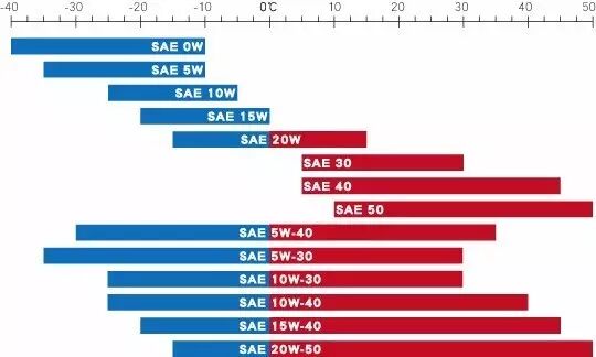 机油分为单级机油(蓝色条低温)、单级机油(红色条高温)和多级机油(蓝红条),在上图表中上下依次排布。一般车主为了方便起见都会选择多级机油,冬季夏季通用,方便又省心。