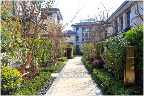 施工中注重树木花草、铺装石材的选择,确保品质效果。宅间直线型与曲线型园路错落分布,绿化种植与硬质景观相映成趣,整个别墅群掩映在葱郁翁翠的树木之中,营造温馨生态的生活氛围。