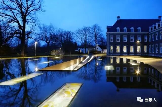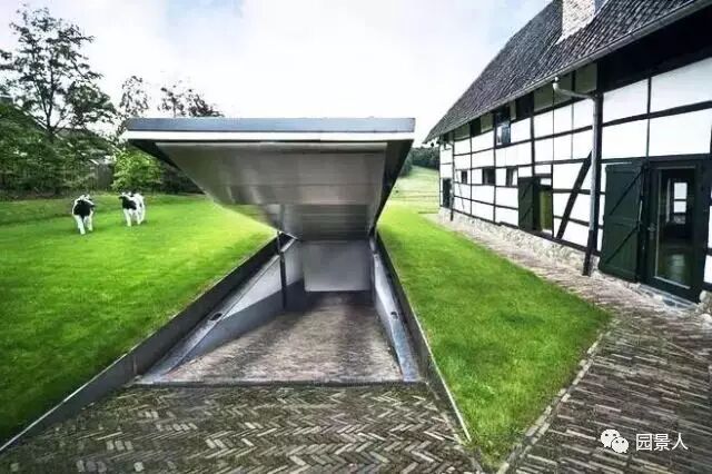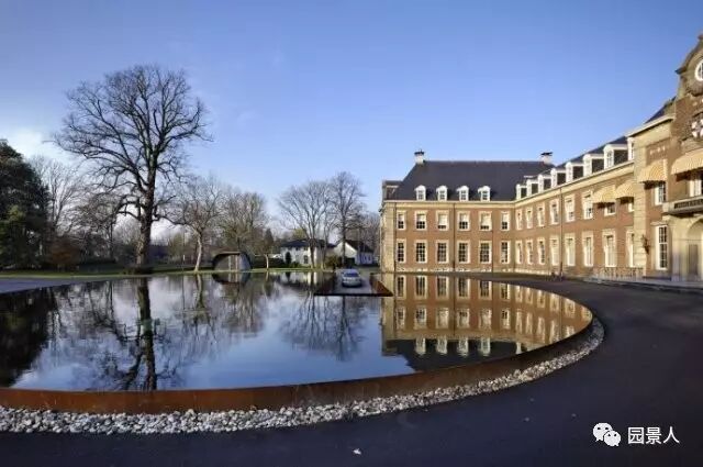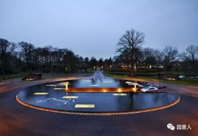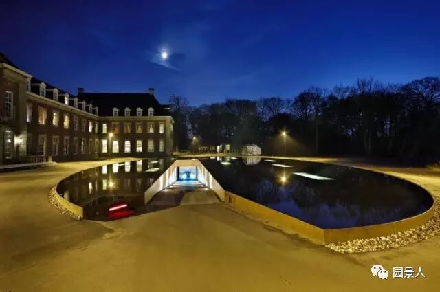 荷兰的海姆斯泰德有一座古老而魅力依旧的,设计师巧妙地将地下车库入口与水池相结合。水面上的倒影,让更显庄重、宁静,也使得景观水池完全融入整个格局中。车辆从水中驶入然后“消失”在水中,非常的梦幻。