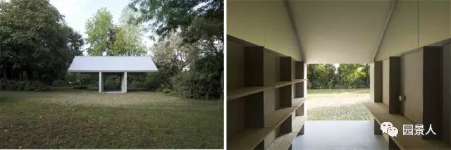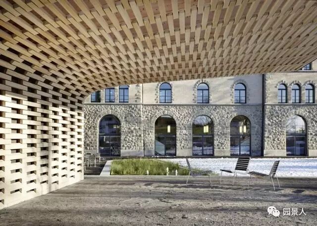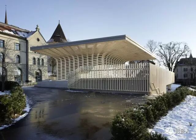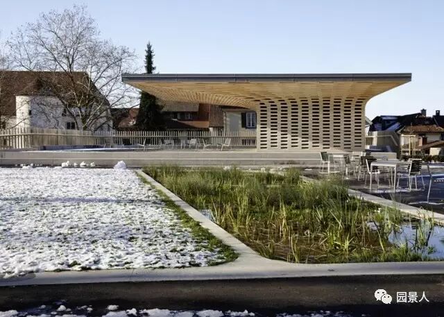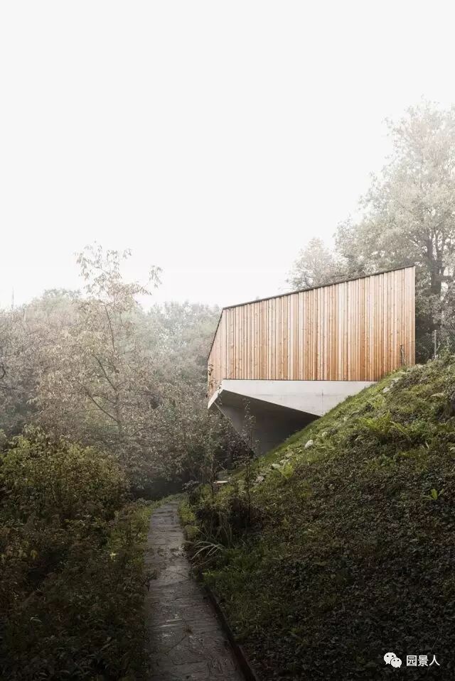 看上去非常精巧别致,建筑由当地Ramser Schmid Architekten工作室设计,整个景观的下面是区域的地下车库及出入口。于是设计师巧妙地将景观与场地结合,创作出一个木块搭建的蘑菇小屋似的休息凉亭,可供访客休息观赏~