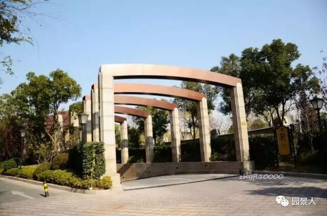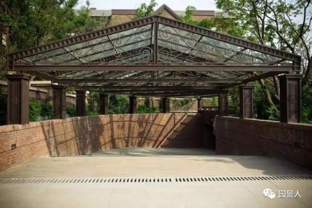 △ 在处理园区中不可规避的建筑构制物时,园区大多使用植被廊架与之结合的手法。如在园区内地下车库的出入口处,利用木质廊架,种植藤蔓植物,将出入口与整体景观完美融合。 序列感和仪式感的体现,同时和园内的廊架景观相呼应。