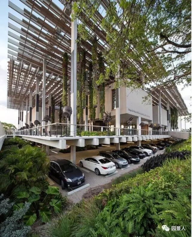 迈阿密艺术博物馆下方独特的停车设计。架空的博物馆体量保护艺术品不受风暴潮的影响,并将停车和储排水设施安置在体量的下方。护坡将灌溉系统的水箱隐藏起来。